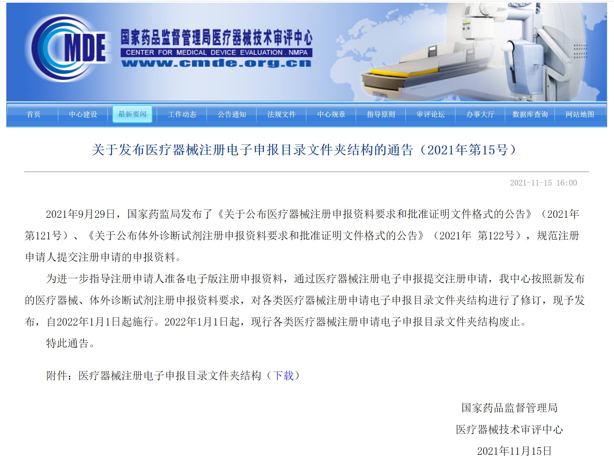 关于发布医疗器械注册电子申报目录文件夹结构的通告(2021年第15号)自2022年1月1日起施行