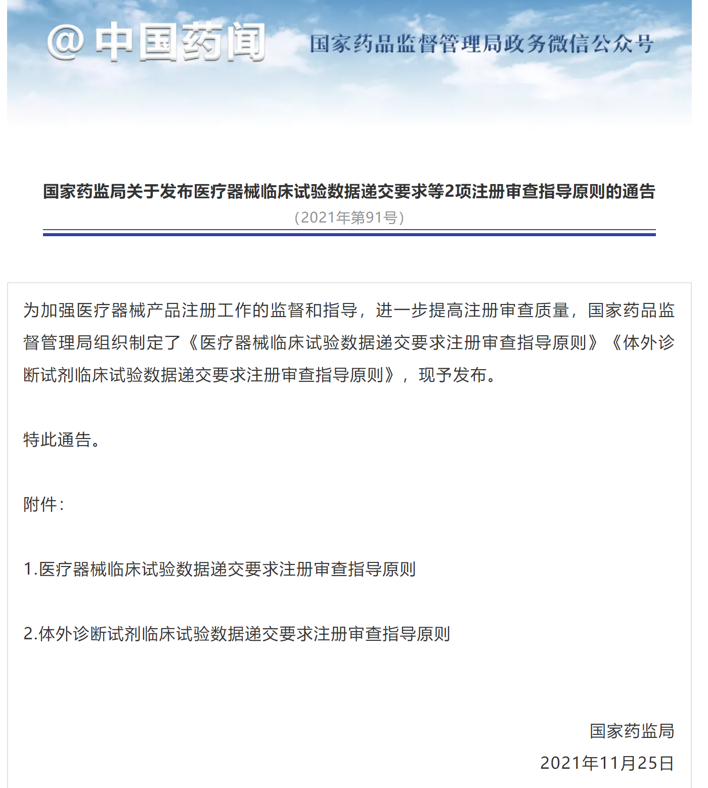 国家药监局关于发布医疗器械临床试验数据递交要求等2项注册审查指导原则的通告 (2021年第91号)