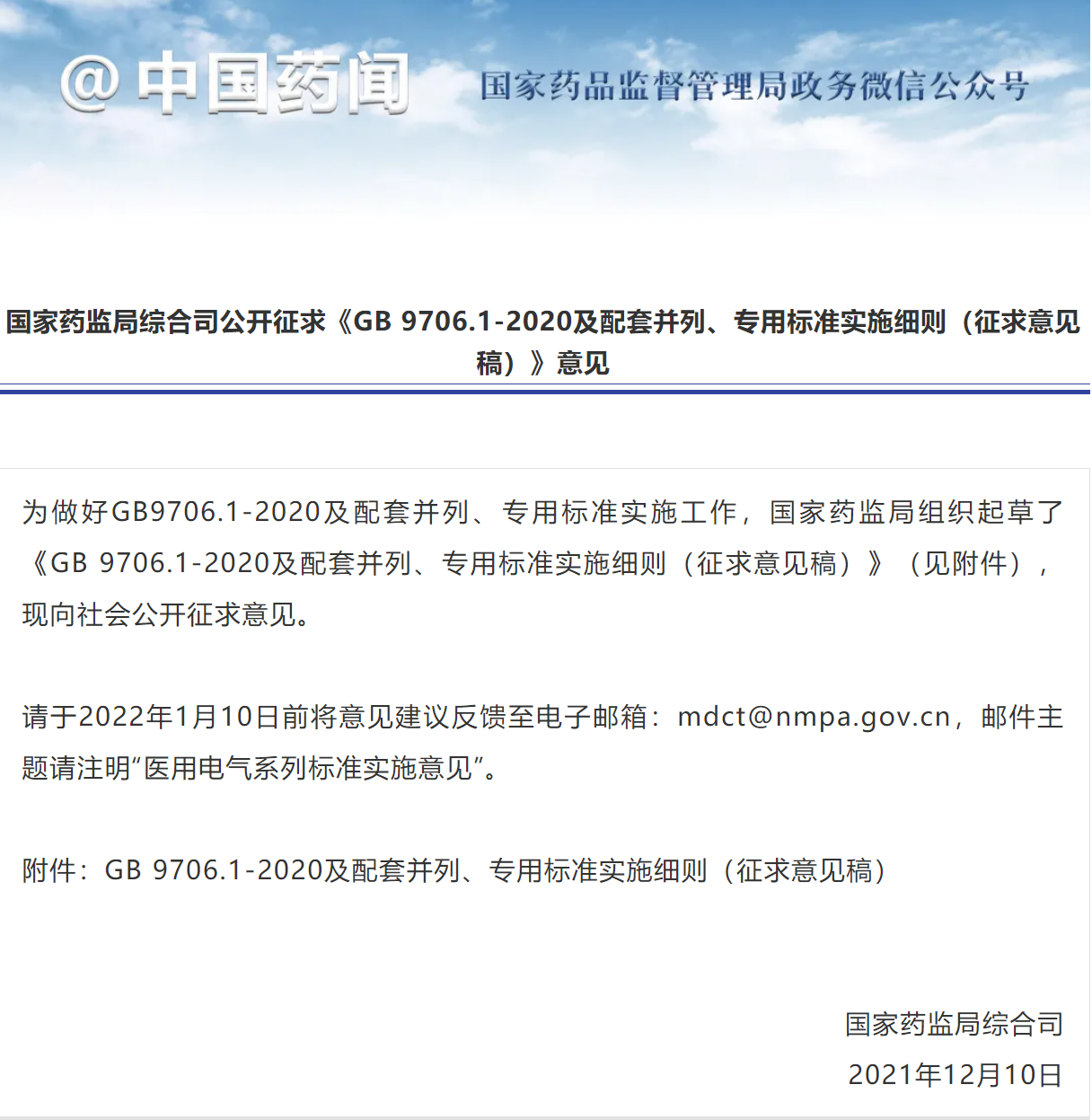 国家药监局综合司公开征求《GB 9706.1-2020及配套并列、专用标准实施细则(征求意见稿)》意见