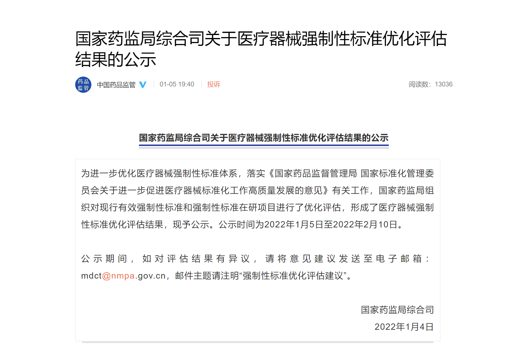 国家药监局综合司关于医疗器械强制性标准优化评估结果的公示