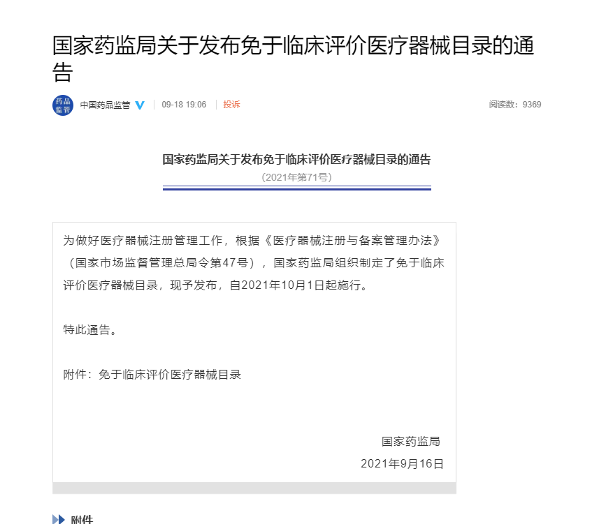 国家药监局关于发布免于临床评价医疗器械目录的通告2021年10月01日起施行