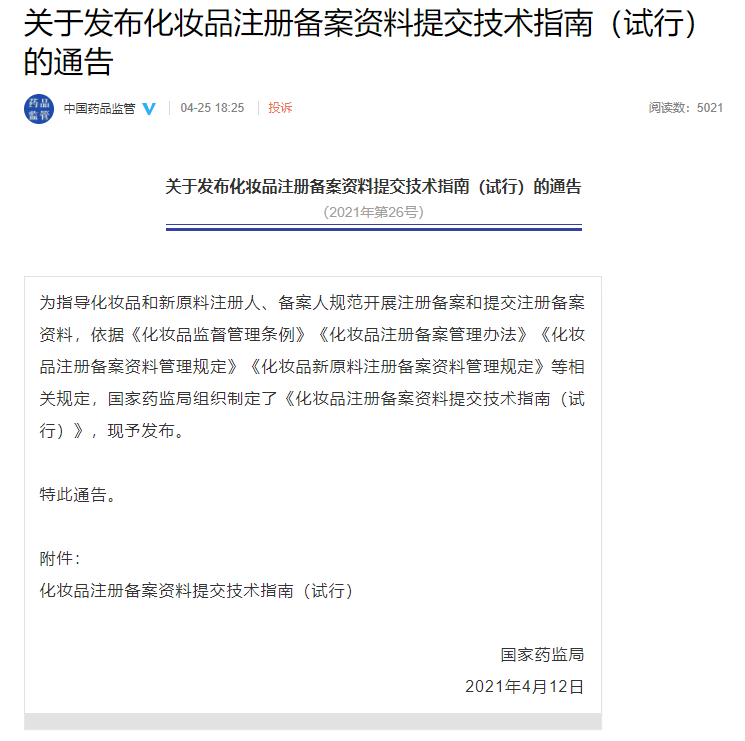 关于发布化妆品注册备案资料提交技术指南(试行)的通告
